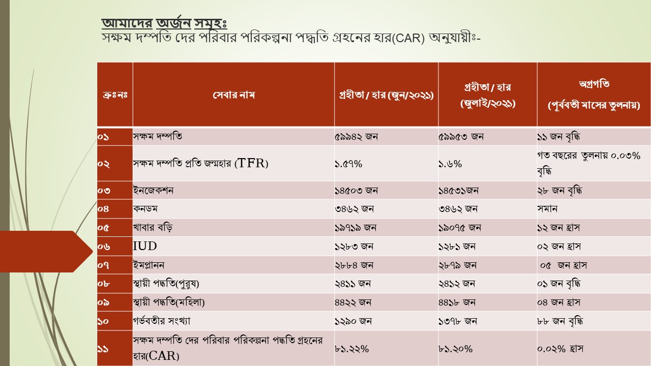 | ০৬ | IUD | ১২৮৩ জন | ১২৮১ জন | ০২ জন হ্রাস |